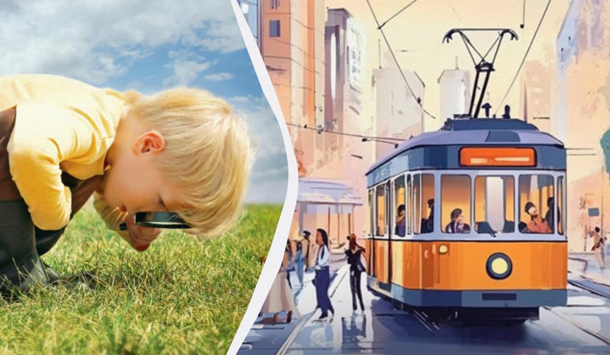Das Bild zeigt eine belebte Straße, auf der Menschen gehen und eine Straßenbahn fährt. Du musst einen Timer auf fünf Sekunden einstellen und den Fehler finden, bevor die Zeit abgelaufen ist. Sind Sie bereit?