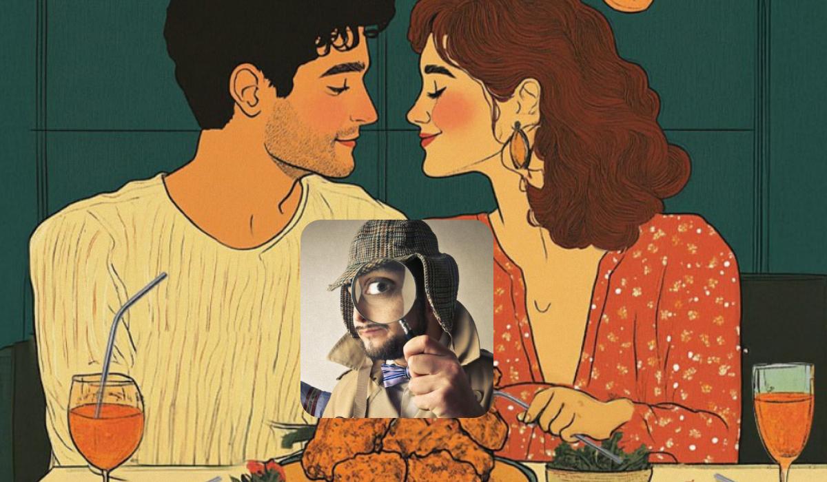 Vor Ihnen stehen ein verliebter Mann und eine verliebte Frau, die sich bei einem romantischen Abendessen angenehm unterhalten. Das Mädchen trägt ein elegantes Kleid, der Mann einen leichten Pullover. Auf dem Tisch stehen Gläser mit Getränken und verschiedene leckere Gerichte. An den Wänden des Lokals hängen Gemälde, und von der Decke hängen Glühbirnen.