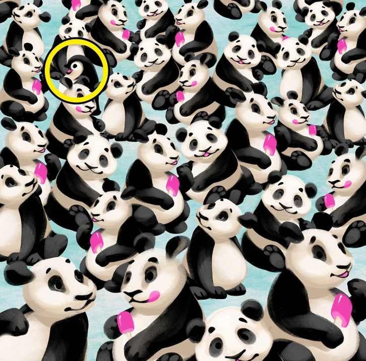 Wenn du dich tagein, tagaus langweilst und deine Arbeitsroutine dir jeglichen Enthusiasmus raubt, versuche, Puzzles zu lösen. Lustige optische Täuschungen bringen Sie zum Lächeln und trainieren Ihre Aufmerksamkeit. Dieses Mal müssen wir den Pinguin unter den Pandas finden.