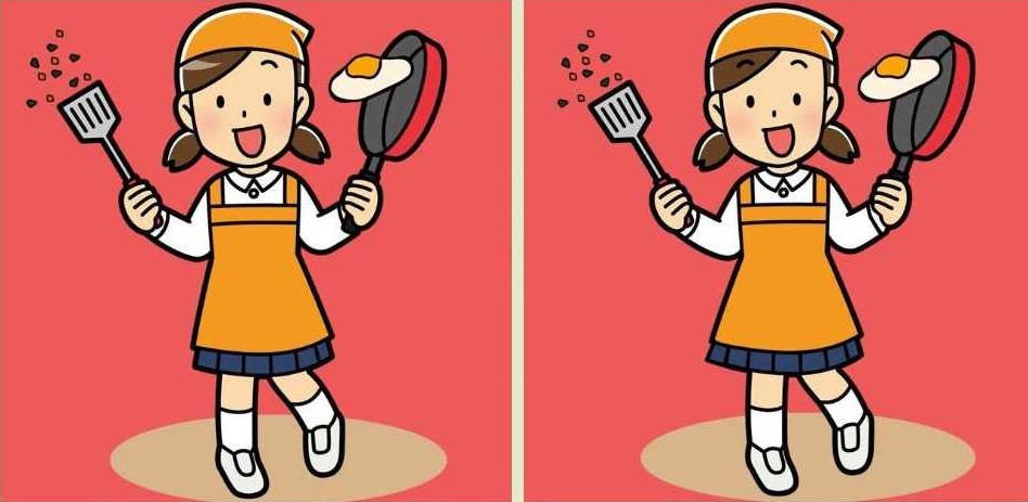 Beide Zeichnungen zeigen ein Mädchen, das Rührei macht. Und sie scheint in Schwierigkeiten zu sein, denn das Spiegelei droht aus der Pfanne auf den Boden zu fallen.