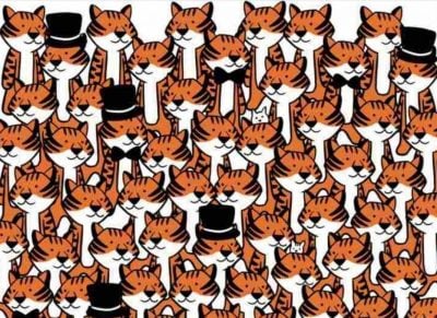 Auf dem Bild sind viele rote und weiße Katzen zu sehen. Einige von ihnen tragen auch schwarze Hüte. Deine Aufgabe ist es, 4 weiße Katzen unter ihnen zu finden. Ja, es gibt sie wirklich, du musst nur sehr genau auf das Bild schauen.