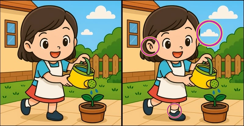Sind Sie also bereit für die nächste Herausforderung? Schauen Sie sich die beiden Bilder eines Mädchens, das eine Pflanze gießt, genau an. Auf den ersten Blick mögen sie gleich aussehen, aber es gibt 3 kleine Unterschiede. Glaubst du, dass du sie alle in 59 Sekunden finden kannst? Probiere es aus und teste deine Sehschärfe!