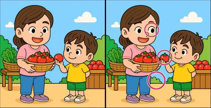 Sind Sie also bereit für die nächste Herausforderung? Schauen Sie sich die beiden Bilder einer Mutter und eines Sohnes, die Tomaten pflücken, genau an. Auf den ersten Blick mögen sie gleich aussehen, aber es gibt 3 kleine Unterschiede. Glaubst du, dass du sie alle in 45 Sekunden finden kannst? Probieren Sie es aus und testen Sie Ihre Sehschärfe!